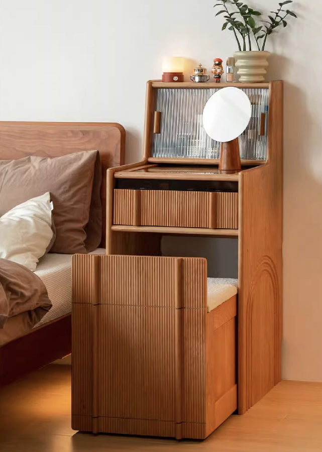 The chair fits perfectly under the dresser and offers extra storage measuring 45 (L) x 40 (D) x 37.5cm (H) inside the chair body -- perfect for stowing your stock of beauty necessities!