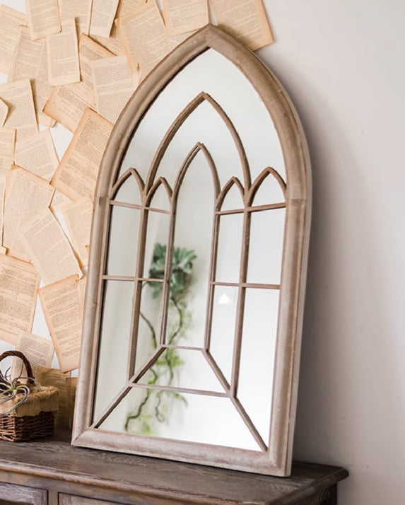 We love these highly ornamental mirrors, which echo the classic shapes and designs from European cathedrals. The finish of the mirror is antique-style and distressed. It'll be great for wabi sabi interiors as well. They'll be great as accent pieces to make your room look bigger.