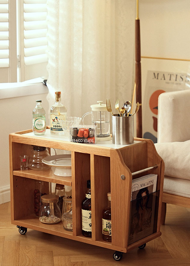 A hold-it-all trolley great for books and drinks. A removable sintered stone top helps to protect the trolley from spills.