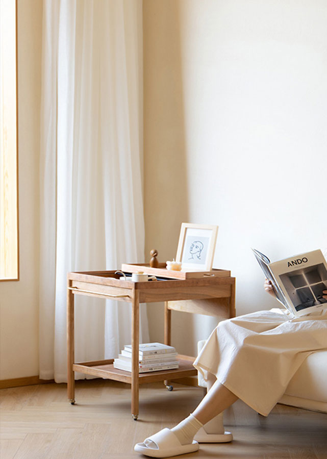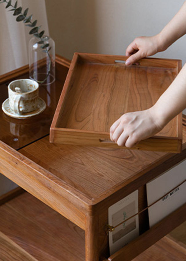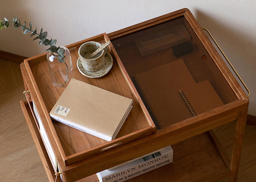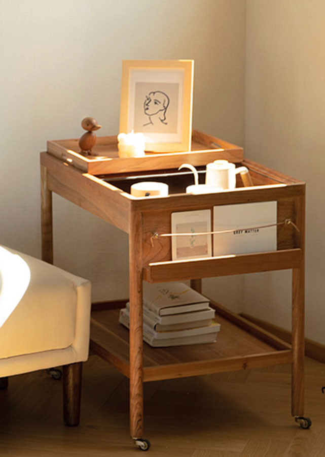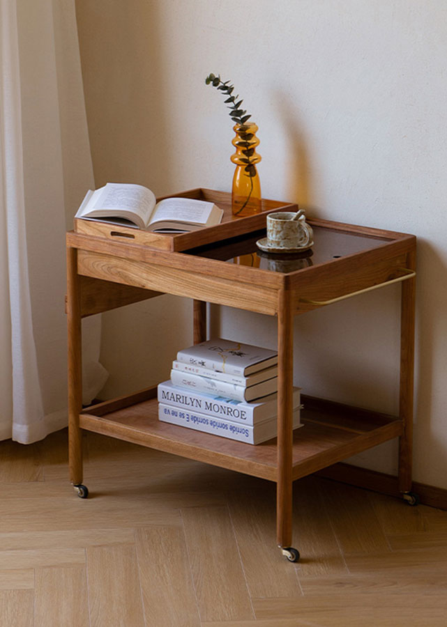 A timeless and classic trolley design. The upper level is designed as closed storage, with a sliding brown glass pane shutting off dust while providing display. A detachable tray is built on top of the upper layer, which you can slide left or right as well.