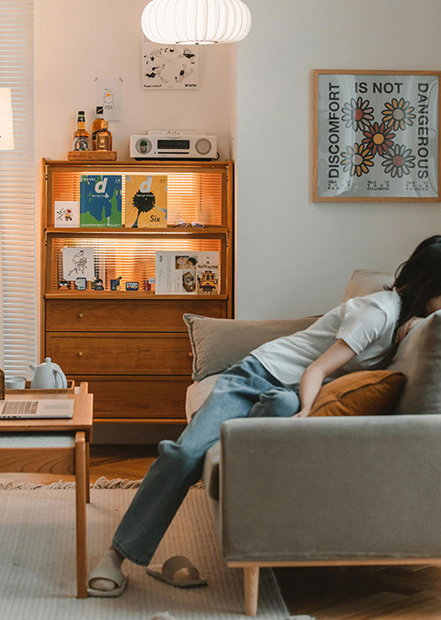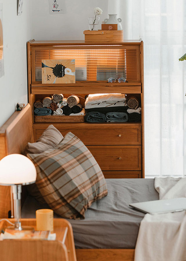 At 126cm tall, the Akouo is one of the tallest cabinets we carry. It's great for those who have limited floor space, but still want a large amount of storage. Storage is closed, making it great for keeping things clean. Ledges on the two pull-up lids give space for self-expression and display. We also appreciate the innovative detail of having a small hole in the drawer (please refer to Picture 6), which allows easy cleaning of any food debris and dirt.
