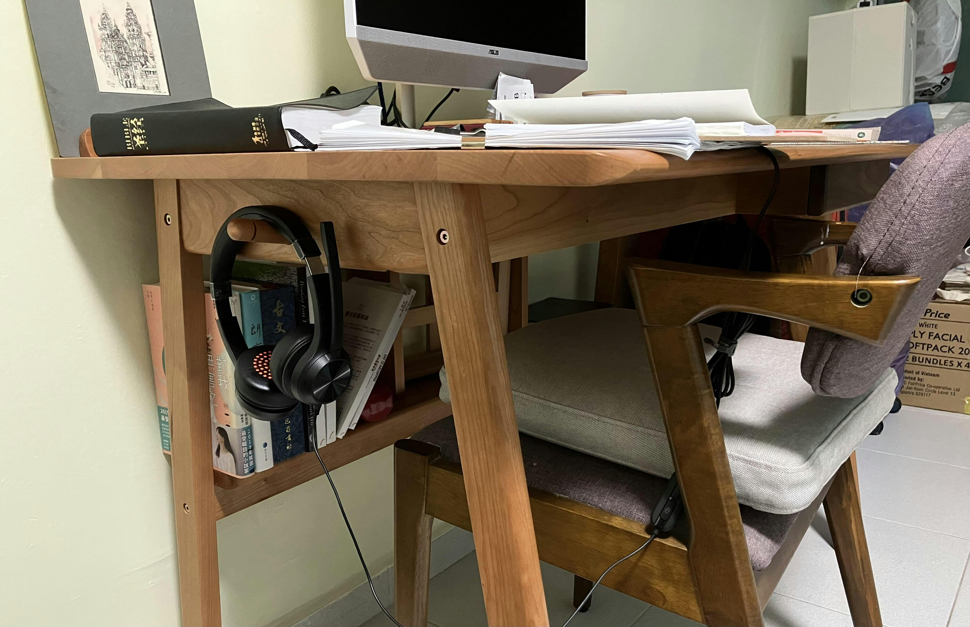 This is even more useful than I first imagined it to be at first sight. The holding knobs by the sides to hold my bags and headset, the extra panel of wood underneath that acts as bookstand for current reading and also the side drawer to keep some stationery all add up to its charm. The hue of cherry wood also goes well with my older piece of furniture. I am simply loving this.