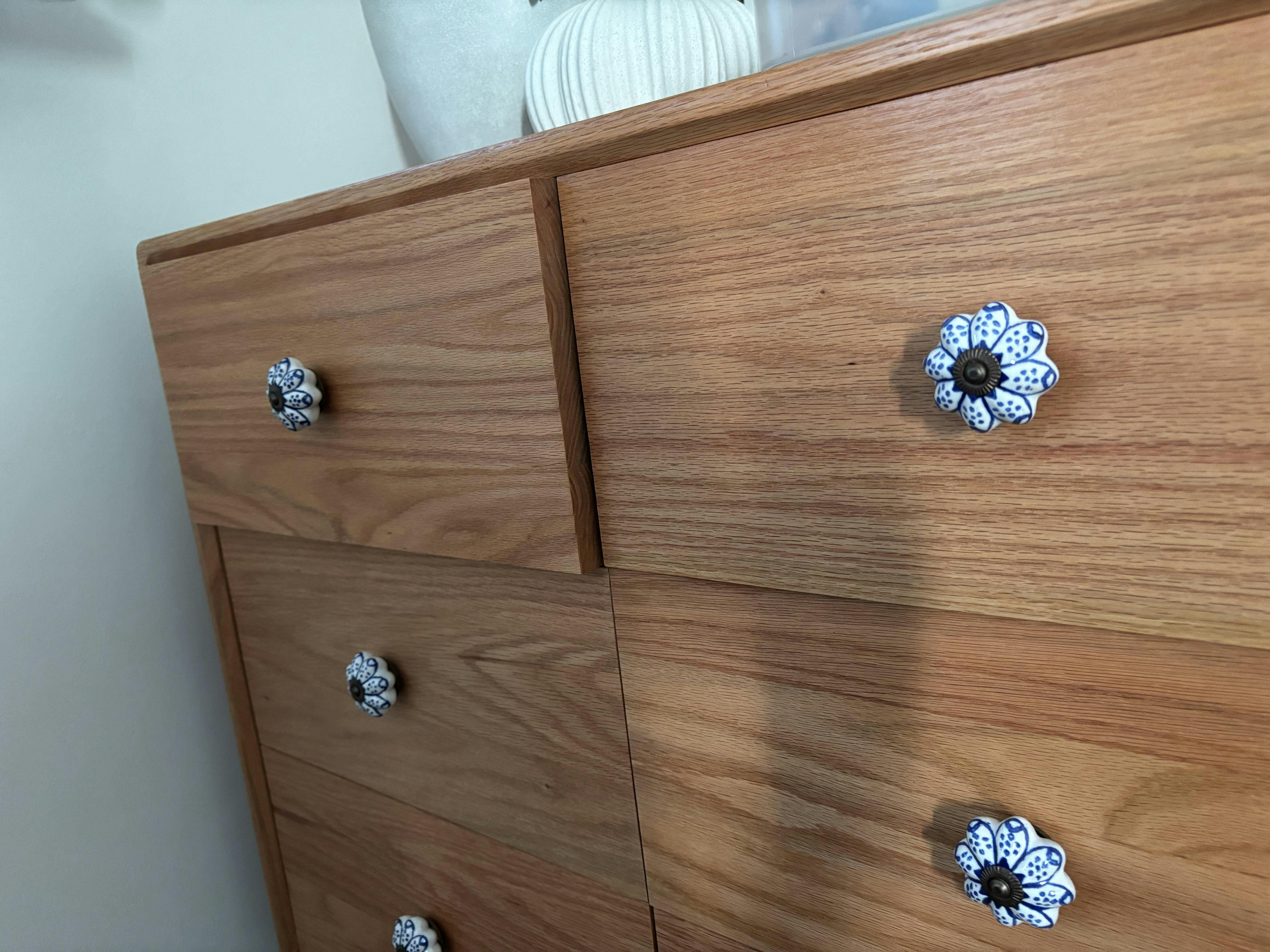 What I do wish though, is that the colour of the actual drawers matched the product images more. I had expected a paler, matte kind of oak which has a more modern look, but the actual drawers have a slightly glossy, reddish-tinted varnish. I changed the knobs to counter this, in order to suit our home décor better. The other thing I do wish is that the wood used on the inside of the drawers could match the quality of the wood on the outside a bit more. The wood used on the inside is of a lower, less solid quality, and the sliding path of the drawers is a bit stiff and clunky. But overall, it’s a solid chest of drawers where the natural grain of the wood is shown off beautifully.