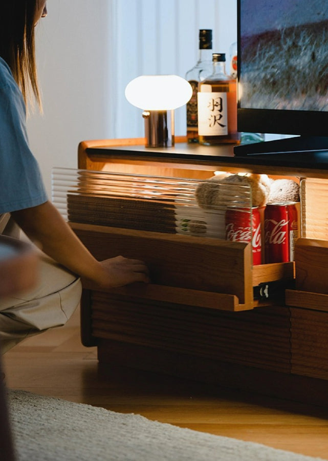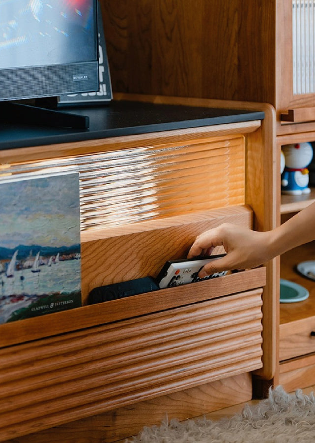 We really enjoy the balance of design elements and mix of materials in the Fidus tv console. The warmth of cherry wood is juxtaposed against sleek black sintered stone. To keep things from getting too dark, the design balances things out with white fluted glass. A ledge of 1.5cm thick doubles up as a drawer handle, as well as shelf space for displaying magazines, or holding remote controls.