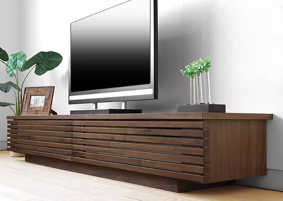 We love the refined and elegant design of the Sollus. The TV console's slat design conceals mess and presents a clean aesthetic. Hidden within are functional storage features, including 2 drawers and 4 open compartments.