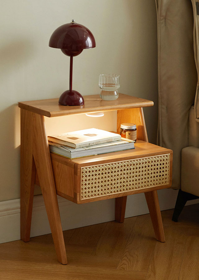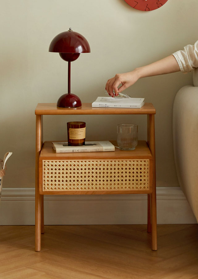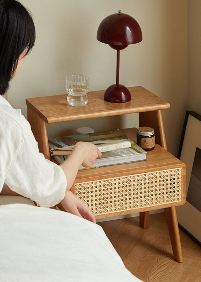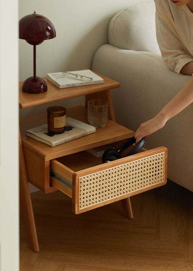 Supplementary material: (Inside of drawer, back of nightstand) Solid pine/empress wood, (drawer face) rattan